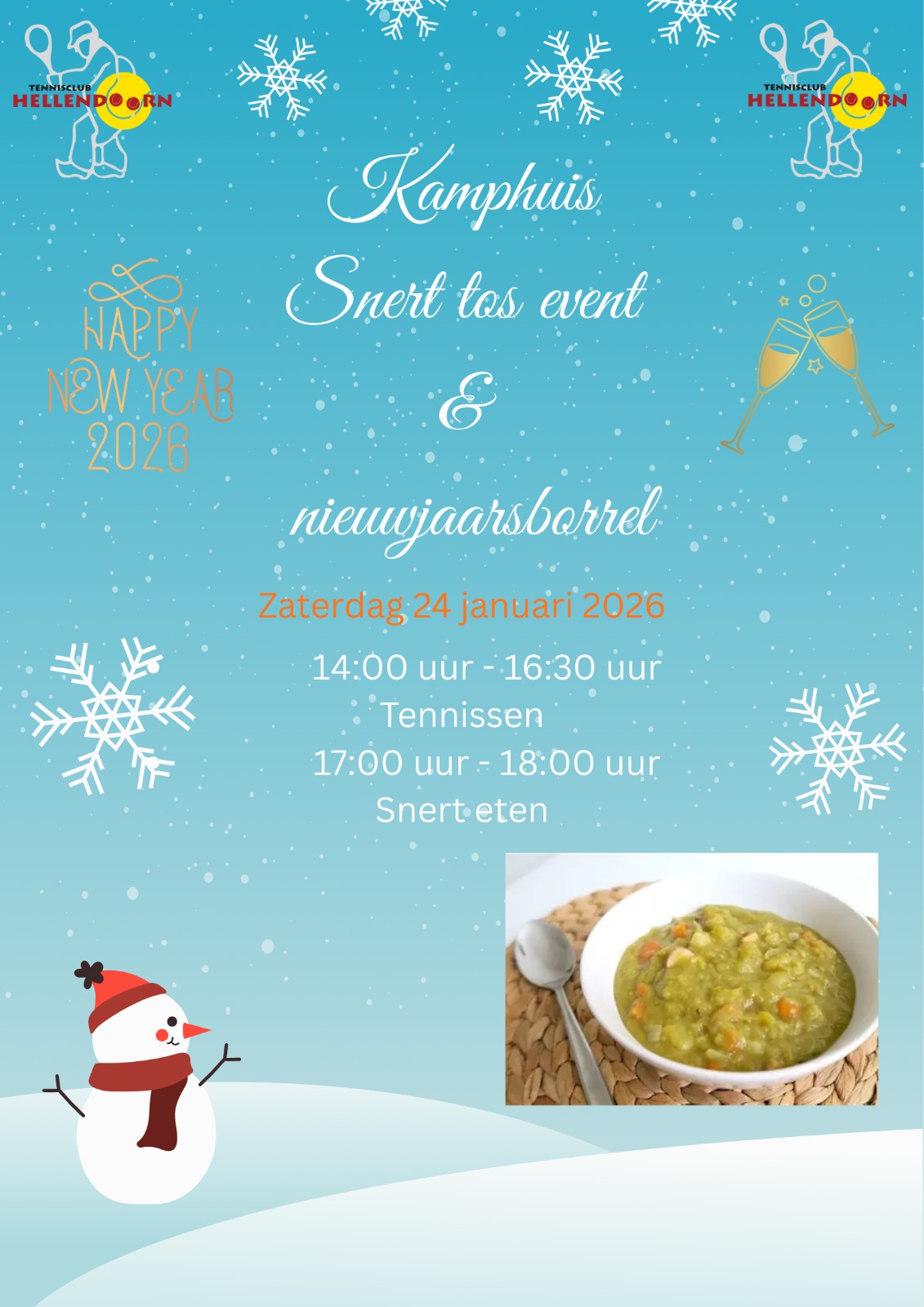 Het is weer tijd voor een gezellige en sportieve wintertraditie! We nodigen jullie van harte uit voor het jaarlijkse Snert tos event bij TC Hellendoorn, dat dit jaar plaatsvindt op zaterdag 24 januari 2026. Dit jaar combineren wij de tos met de nieuwjaarsborrel.