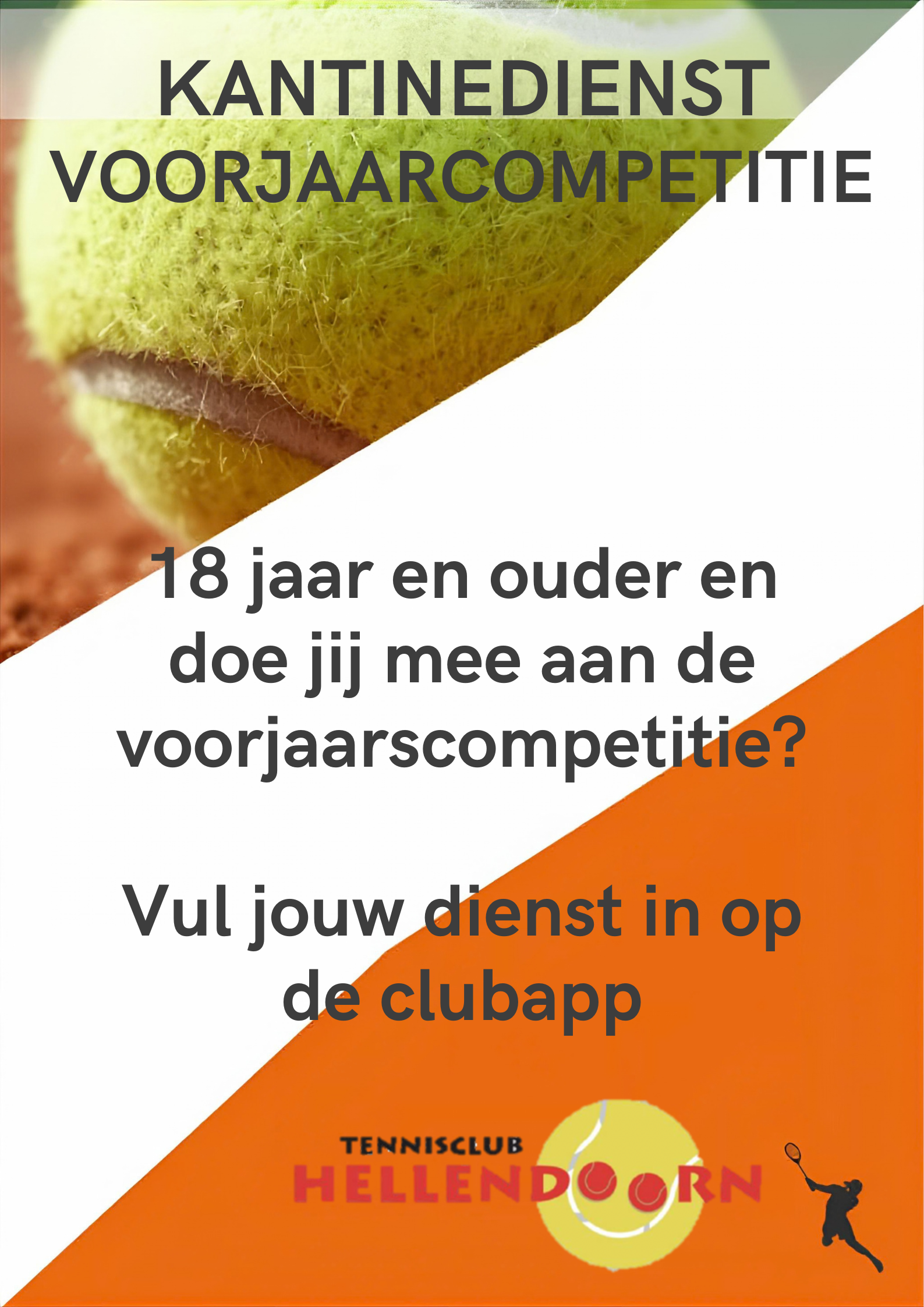 De voorjaarscompetitie staat weer voor de deur! Dit jaar doen er maar liefst 19 teams mee, en uiteraard willen zij allemaal gebruikmaken van onze kantine. Net als vorig jaar is het verplicht voor alle deelnemende teams waarvan de spelers 18 jaar of ouder zijn om kantinediensten te draaien.
