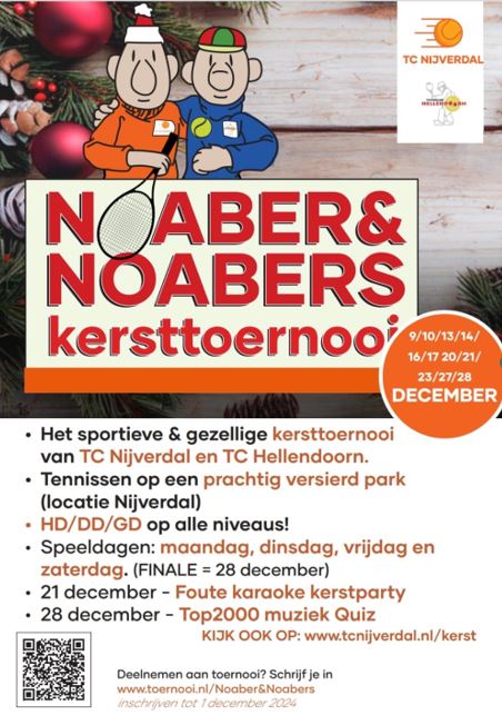 Dit jaar zouden wij het Noaber & Noabers Kersttoernooi organiseren. Zoals jullie hebben kunnen lezen wordt dat, in verband met de verbouwing, een uitdaging dit jaar. Op het moment van het toernooi zal er in de kantine schuimbeton worden gestort en als deze droog is wordt de vloerverwarming en de cementdekvloer aangebracht. Daarom hebben wij TC Nijverdal gevraagd of zij komend jaar nogmaals het toernooi willen organiseren. Gelukkig heeft TC Nijverdal ons de helpende hand toegereikt en nemen zij de organisatie van het kersttoernooi op zich. Opgeven voor het toernooi? Klik dan HIER
